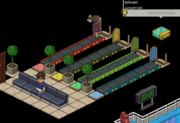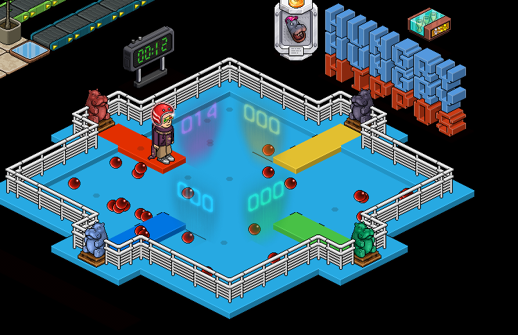 Do not walk off of your platform otherwise you will be teleported out of the game. Walk back and forth on your coloured platform, stepping on the red blobs as they move around.